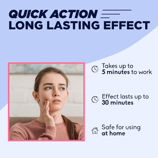 • Quicky Topical Comfort - Even at home you can use our CandiCaine gel to help alleviate tooth discomfort until reaching the dental office. It usually takes about 5 to 6 seconds for the numbing sensation to appear.